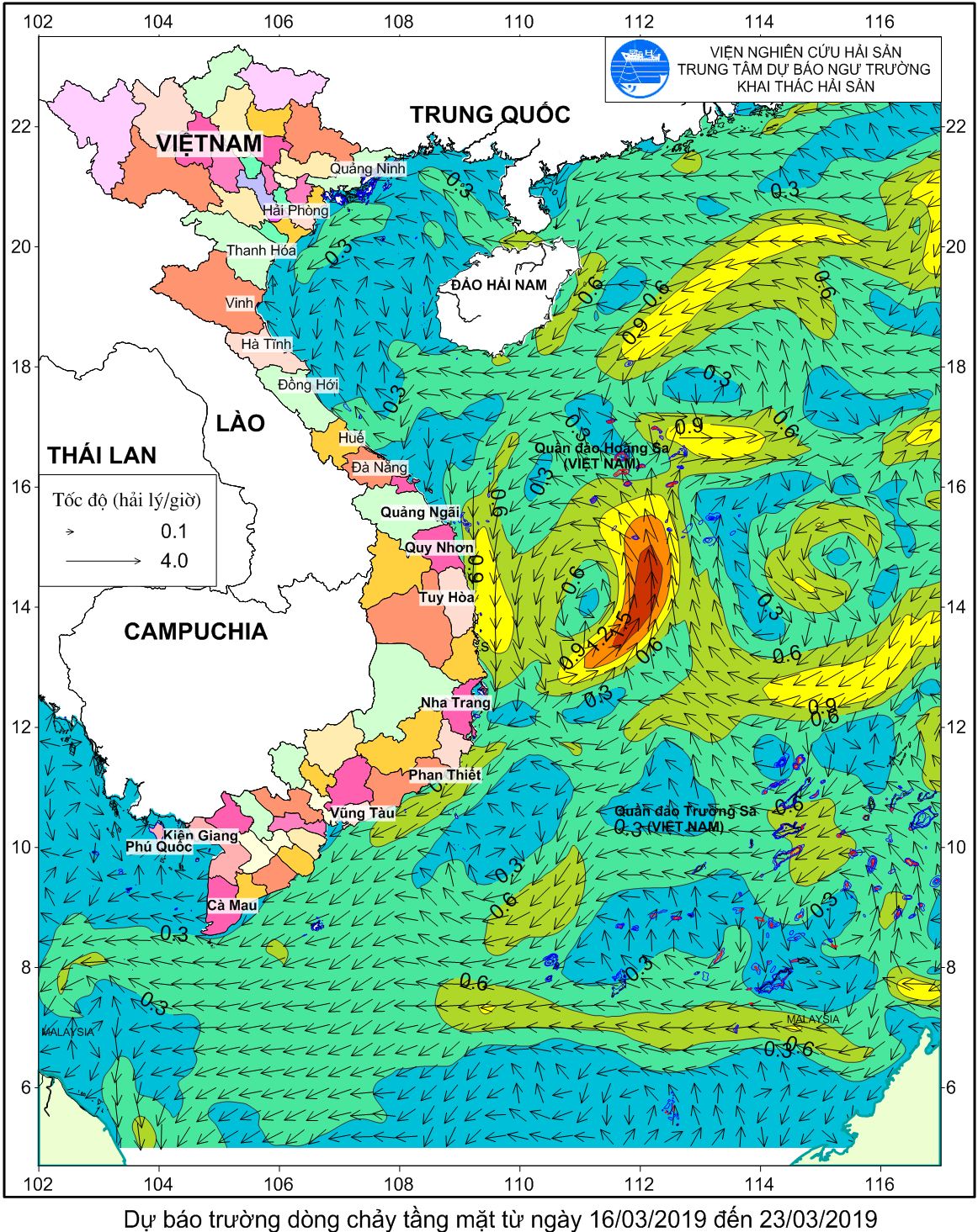 Trang nhất/ Dự báo khai thác theo đối tượng Dự báo trường dòng chảy tầng mặt từ ngày 16/3/2019-23/3/2019 Mùa vụ: Vụ Nam () | Năm dự báo: 2019 | Tháng dự báo: 03/2019 Đối tượng dự báo: Trường dòng chảy tầng mặt Cơ quan dự báo: Trung tâm Dự báo ngư trường Khai thác hải sản