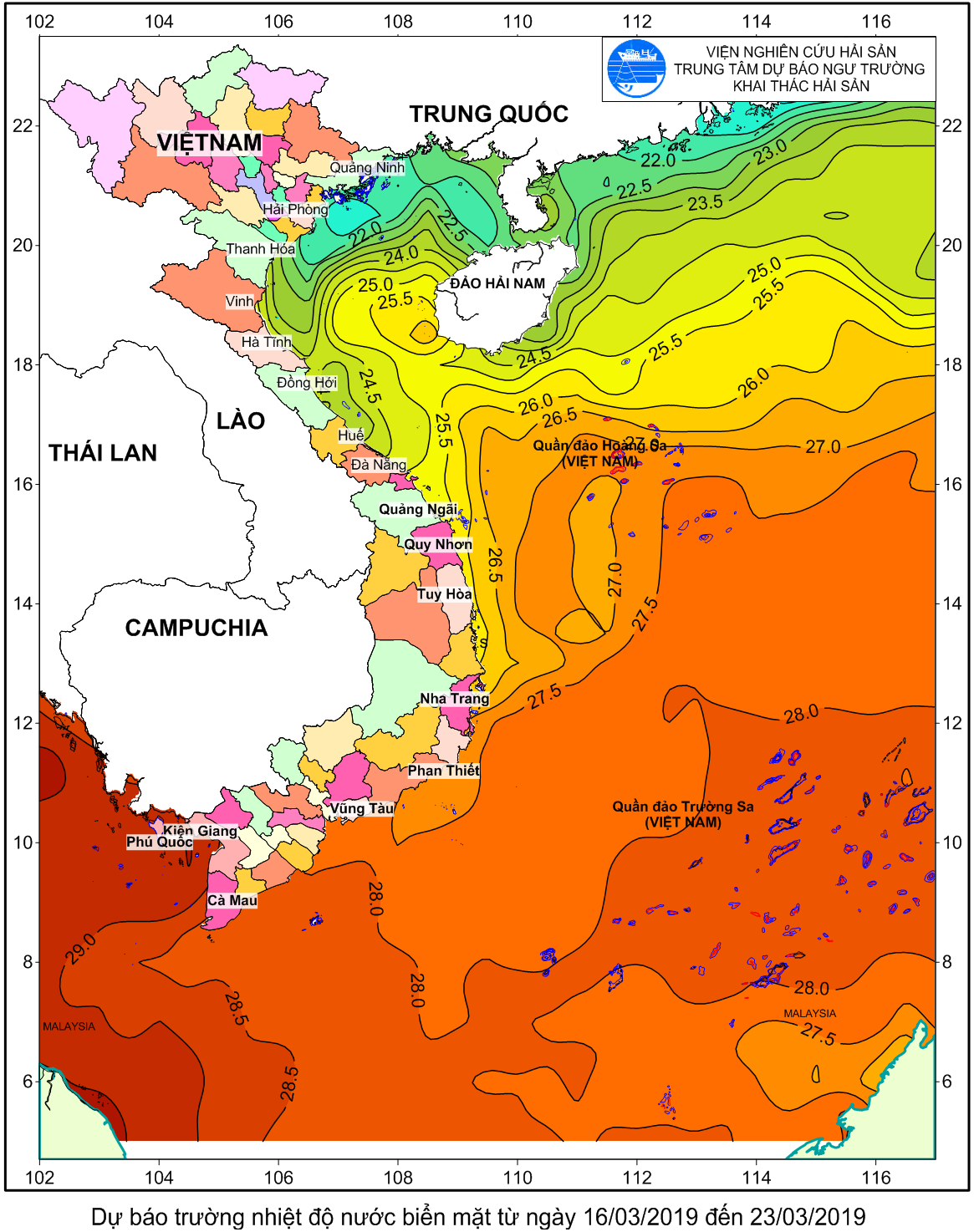 Trang nhất/ Dự báo khai thác theo đối tượng Dự báo trường nhiệt độ nước biển mặt từ ngày 16/3/2019-23/3/2019 Mùa vụ: Vụ Nam () | Năm dự báo: 2019 | Tháng dự báo: 03/2019 Đối tượng dự báo: Trường nhiệt độ nước biển mặt Cơ quan dự báo: Trung tâm Dự báo ngư trường Khai thác hải sản