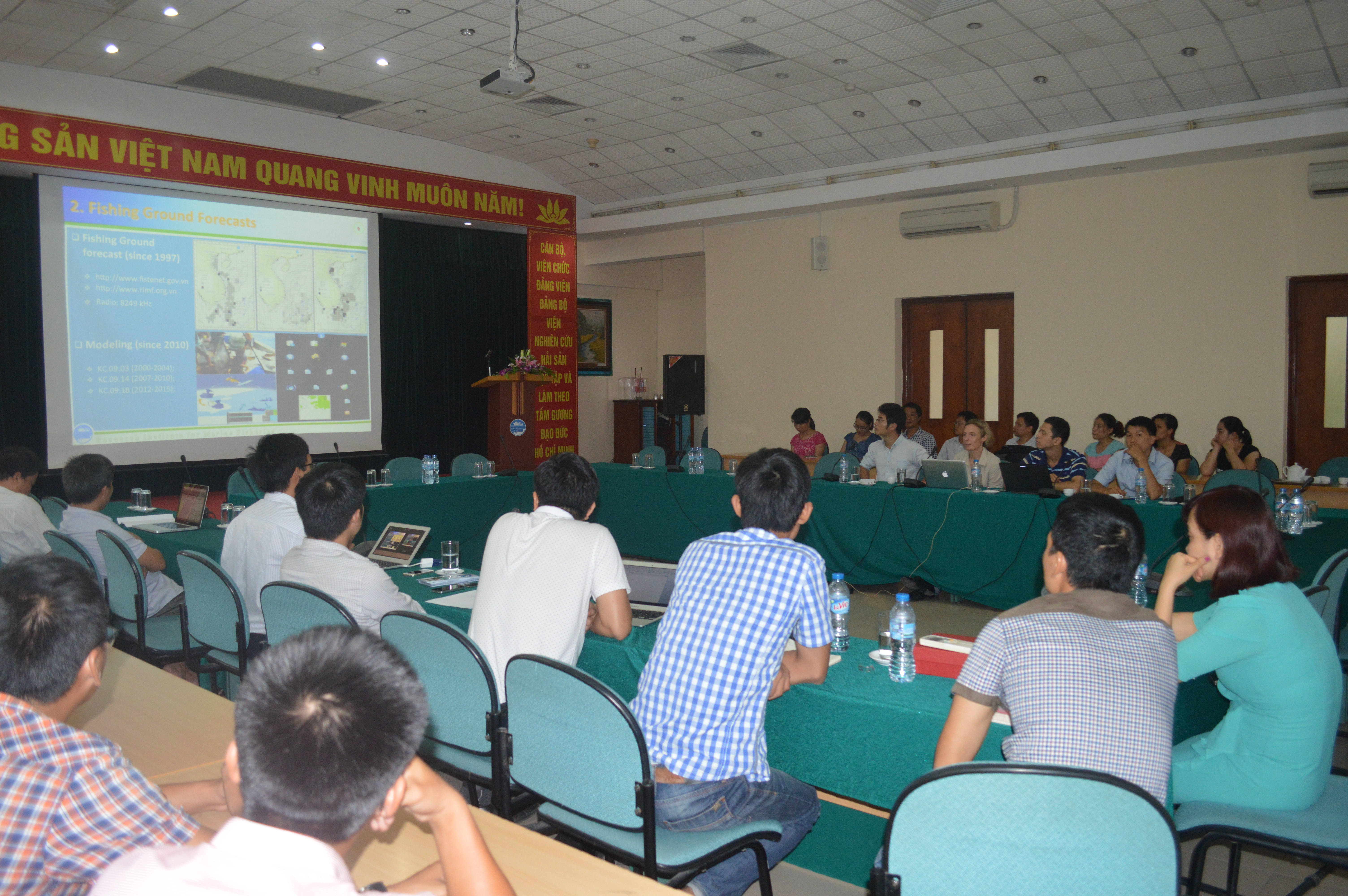 Tại buổi làm việc, ông Nguyễn Viết Nghĩa đã giới thiệu tóm tắt về Viện nghiên cứu Hải sản; là viện duy nhất nghiên cứu nghề cá biển ở Việt Nam; thực hiện nhiệm vụ nghiên cứu khoa học và công nghệ nghề cá biển với các lĩnh vực như: Đánh giá nguồn lợi hải sản và đa dạng sinh học biển; công nghệ khai thác; công nghệ bảo quản sau thu hoạch và chế biến hải sản, công nghệ sinh học biển, quan trắc, dự báo ngư trường giúp ngư dân khai thác trên biển, đào tạo nghề và chuyển giao công nghệ…; TS. Nguyễn Khắc Bát và Ths. Phan Hồng Dũng và các cán bộ khoa học của Viện cũng trao đổi về thực trạng nghiên cứu và quản lý cá mập và cá đuối ở Việt Nam trong thời gian qua, với mong muốn được học hỏi, trao đổi kinh nghiệm và nâng cao năng lực nghiên cứu, giám định mẫu vật sinh vật biển.