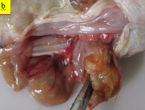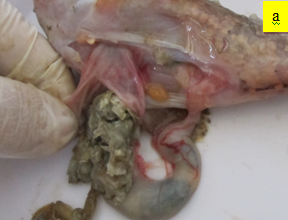 Hình 2. Hình (a) & (b) Dạ dày cá Mao ếch có thức ăn là ghẹ và tôm