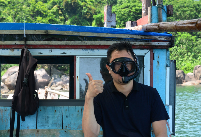 Phóng viên Báo Nông nghiệp Việt Nam đang tập thở bằng ống snorkel ở trên tàu. Ảnh: Công Điền