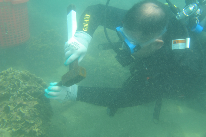 Cán bộ Viện Nghiên cứu Hải sản đang tách san hô giống. Ảnh: Công Điền.
