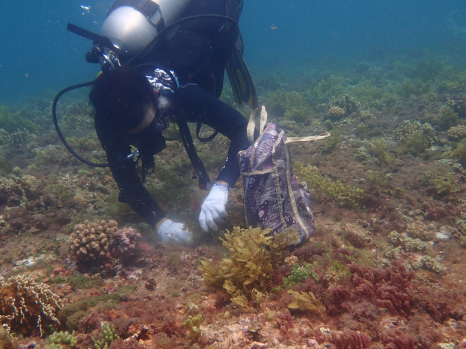 Lặn xuống đáy biển để thu thập rong giống. Ảnh: CĐ.