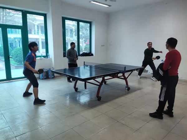 Phần thi đấu bóng bàn đôi nam giữa Viện NCHS và Trường Cao đẳng Thủy sản và Công nghệ Thực phẩm
