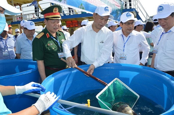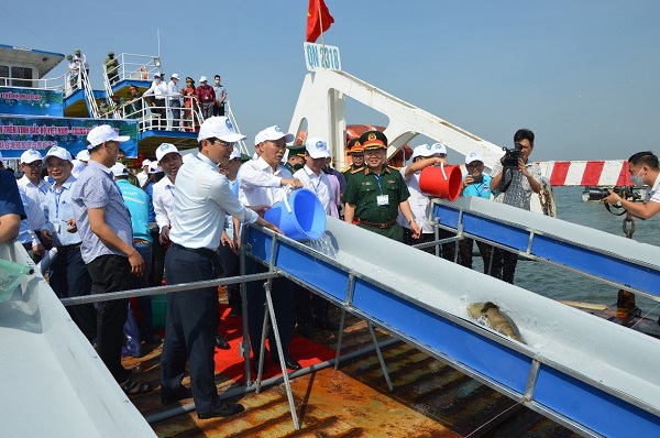 Thứ trưởng Phùng Đức Tiến cùng Phó Chủ tịch tỉnh Quảng Ninh Phạm Văn Thành thả cá song bố mẹ để tái tạo nguồn lợi