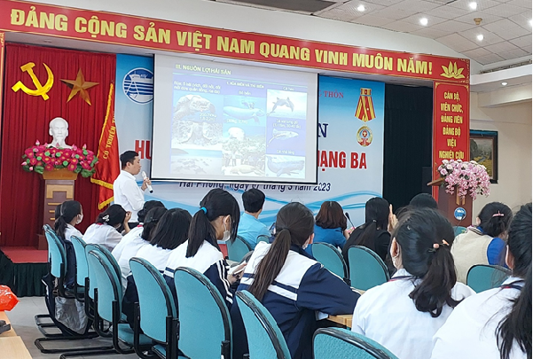 Tại đây, các quý thầy, cô và các em học sinh được nghe TS. Trần Văn Cường giới thiệu các thông tin về “Biển và nguồn lợi hải sản ở biển Việt Nam”, lịch sử hình thành và phát triển Viện Nghiên cứu Hải sản và các hoạt động nghiên cứu khoa học biển. Qua đó, nhằm giúp các em học sinh có ý thức hơn về chủ quyền biển đảo Việt Nam, hiểu rõ hơn về đa dạng sinh học, nguồn lợi hải sản và vai trò của chúng đối với đời sống con người. Trước thực trạng, đa dạng sinh học suy giảm và nguồn lợi hải sản bị khai thác hải sản quá mức, cùng với suy thoái môi trường ven biển và biến đổi khí hậu là những cảnh báo lớn đối với biển và tài nguyên biển. Các nguyên nhân chính được chỉ rõ và trên cơ sở đó, các giải pháp thiết thực, phù hợp với lứa tuổi học sinh đã được truyền đạt và gửi thông điệp đến các em. Trong đó, đặc biệt chú trọng đến các giải pháp tuyên truyền, nâng cao nhận thức cộng đồng; tích cực tham gia hoạt động bảo vệ đa dạng sinh học và bảo tồn biển; nói không với khai thác, tàng trữ, buôn bán và sử dụng loài thủy sản nguy cấp, quý, hiếm; tham gia các hoạt động làm sạch môi trường biển và giảm thiểu rác thải nhựa; trồng rừng ngập mặn; bảo vệ nguồn lợi, thả giống tái tạo và phục hồi nguồn lợi thủy sản.