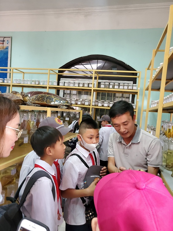 Tiếp nối buổi trải nghiệm, quý thầy, cô và các em học sinh được thăm quan và khám phá Bảo tàng sinh vật biển, nơi lưu trữ và trưng bày trên 2.500 mẫu sinh vật biển phục vụ công tác tác nghiên cứu khoa học, đào tạo và giáo dục cộng đồng. Nhiều loài hải sản có kích thước lớn, có đặc điểm hình thái đặc trưng đã làm tăng sự thích thú, tò mò và trí tưởng tượng của các em, điển hình là loài cá nhám voi, cá heo, cá đuối, cá giống sao, cá ó dơi, cá mập, cá mặt trăng, cá cờ, cá kiếm, cá ngừ vây vàng, cá song, cá nóc, vích, đồi mồi, quản đồng, rùa da, trai tai tượng, rắn biển, ốc gáo, ốc tù và …