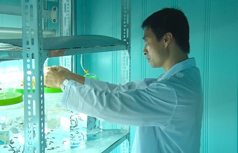 Các nhà khoa học Phòng Nghiên cứu Công nghệ sinh học biển (Viện nghiên cứu Hải sản) nghiên cứu quy trình công nghệ nhân giống rong sụn. Ảnh: Đinh Mười.
