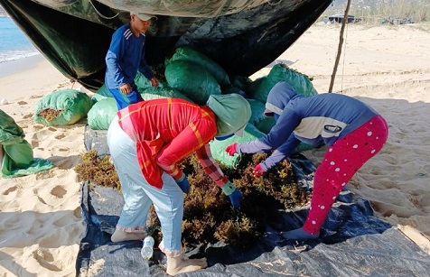 Người dân di chuyển giống rong sụn nuôi cấy mô ra khỏi khu vực Cà Ná để tránh nắng nóng. Ảnh: Đinh Mười.
