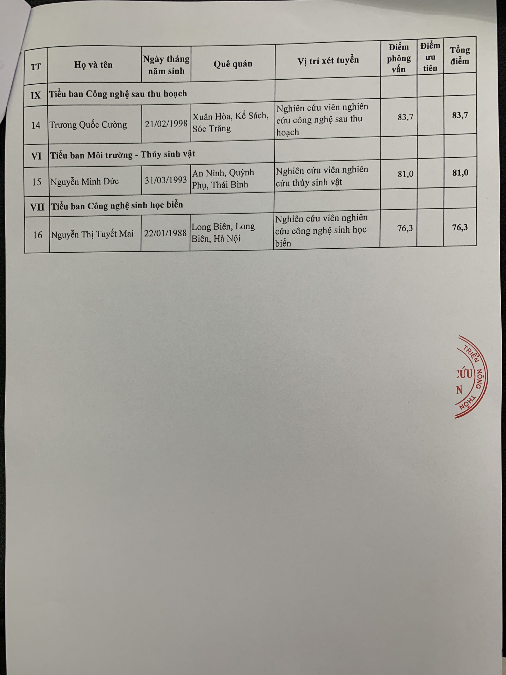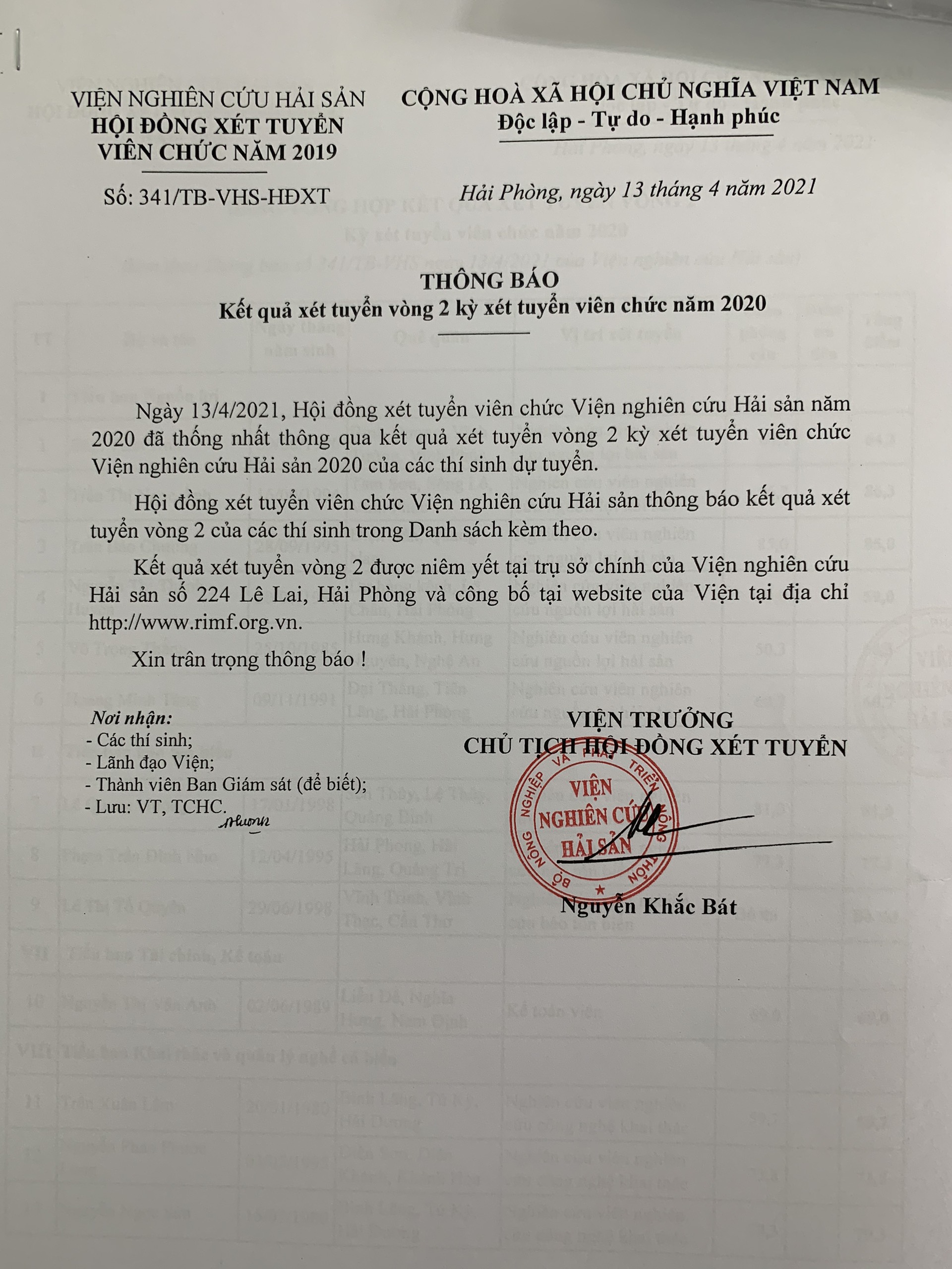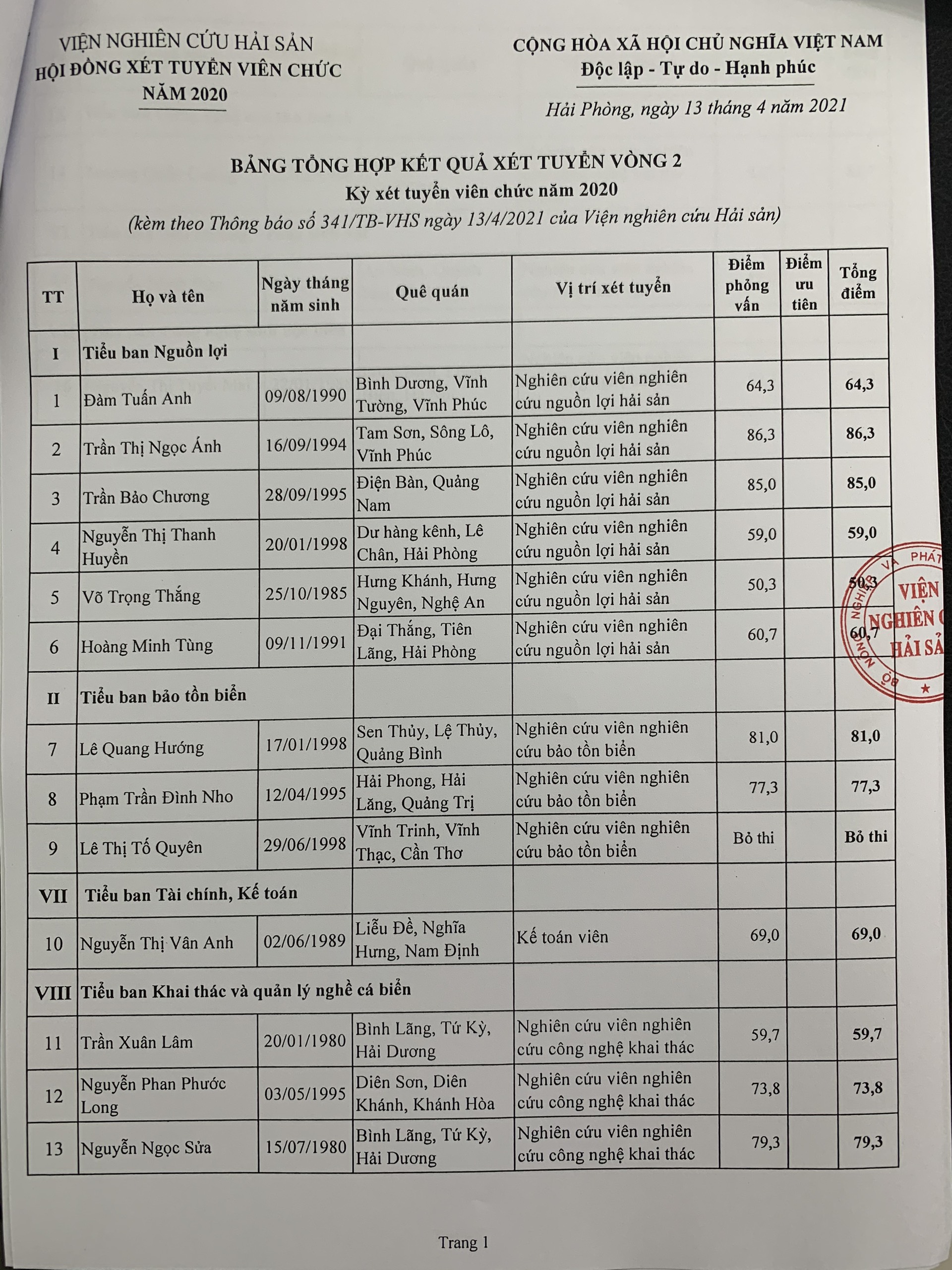 Hội đồng xét tuyển viên chức Viện nghiên cứu Hải sản thông báo kết quả xét tuyển vòng 2 của các thí sinh trong Danh sách kèm theo.