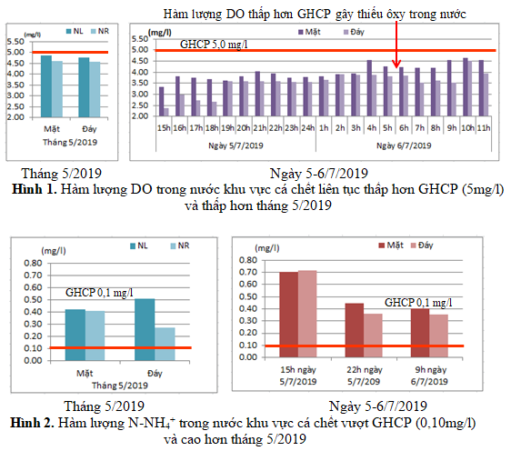 Môi trường nước tại khu vực cá chết bị ô nhiễm hữu cơ nghiêm trọng, biểu hiện là nước có màu vàng nhạt, nhiều vẩn đục. Hàm lượng DO, đặc biệt tại tầng đáy, thấp hơn nhiều so với giới hạn cho phép (5,0mg/l) theo QCVN 10-MT: 2015/BTNMT và thấp hơn nhiều so với tháng 5/2019. Hàm lượng N-NH4+ vượt giới hạn cho phép (0,1mg/l) nhiều lần và P-PO43- tăng hơn so với đợt quan trắc tháng 5/2019, trong khi hàm lượng COD cao bất thường.