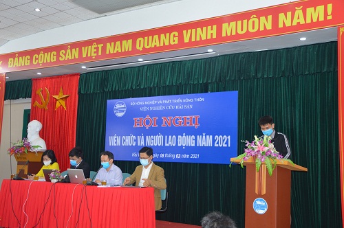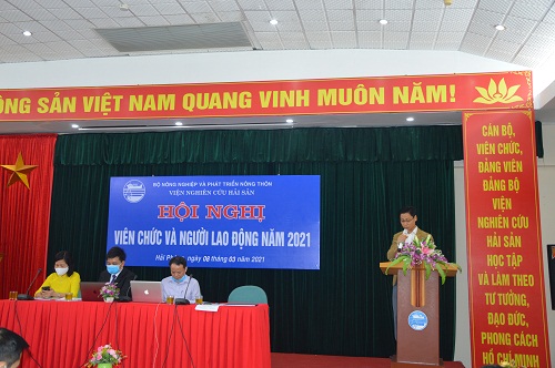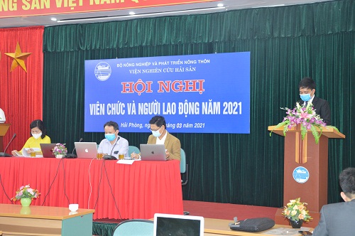 Khai mạc Hội nghị, Phó Viện trưởng Nguyễn Viết Nghĩa trình bày Báo cáo tổng kết công tác năm 2020, phương hướng nhiệm vụ năm 2021. Báo cáo đưa ra các kết quả nghiên cứu đã đạt được trong năm 2020, đánh giá tổng thể ưu nhược điểm và nguyên nhân, thông báo kế hoạch hoạt động năm 2021, các hướng nghiên cứu khoa học trong lĩnh vực thủy sản, ứng dụng công nghệ tiên tiến phát triển kinh tế biển, gắn kết công tác nghiên cứu khoa học và đào tạo.