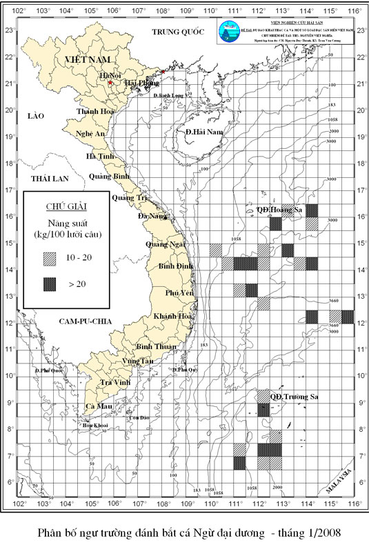 Trang nhất/ Dự báo khai thác theo nghề Câu vàng cá ngừ, Vụ Bắc, 01_2008 năm 2007 Mùa vụ: Vụ Nam (01_2008) | Năm dự báo: 2008 | Tháng dự báo: 01/2008 Nghề: Câu cá ngừ đại dương Cơ quan dự báo: