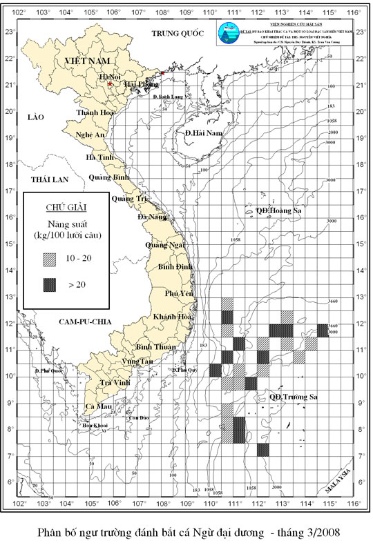 Trang nhất/ Dự báo khai thác theo nghề Câu vàng cá ngừ, Vụ Bắc, 03_2008 năm 2007 Mùa vụ: Vụ Nam (03_2008) | Năm dự báo: 2008 | Tháng dự báo: 03/2008 Nghề: Câu cá ngừ đại dương Cơ quan dự báo: