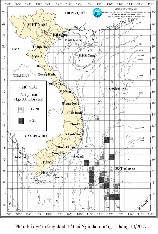 Trang nhất/ Dự báo khai thác theo nghề Câu vàng cá ngừ, Vụ Bắc, 10 năm 2007 Mùa vụ: Vụ Nam (10) | Năm dự báo: 2007 | Tháng dự báo: 10/2007 Nghề: Câu cá ngừ đại dương Cơ quan dự báo: