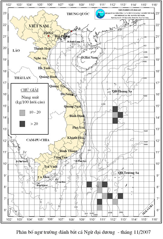 Trang nhất/ Dự báo khai thác theo nghề Câu vàng cá ngừ, Vụ Bắc, 11 năm 2007 Mùa vụ: Vụ Nam (11) | Năm dự báo: 2007 | Tháng dự báo: 11/2007 Nghề: Câu cá ngừ đại dương Cơ quan dự báo:
