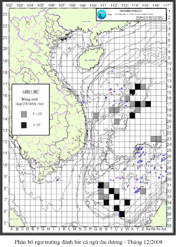 Trang nhất/ Dự báo khai thác theo nghề Câu vàng cá ngừ, Vụ Bắc, 12 năm 2008 Mùa vụ: Vụ Nam (12) | Năm dự báo: 2008 | Tháng dự báo: 12/2008 Nghề: Câu cá ngừ đại dương Cơ quan dự báo: