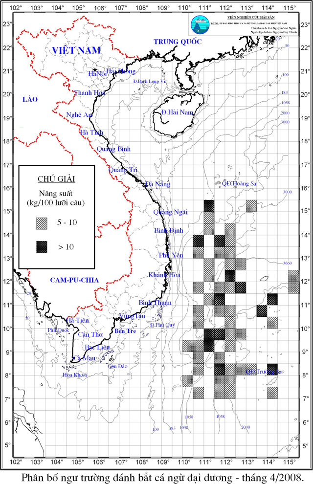 Trang nhất/ Dự báo khai thác theo nghề Câu vàng cá ngừ, Vụ Nam, 04 năm 2008 Mùa vụ: Vụ Nam (04) | Năm dự báo: 2008 | Tháng dự báo: 04/2008 Nghề: Câu cá ngừ đại dương Cơ quan dự báo: