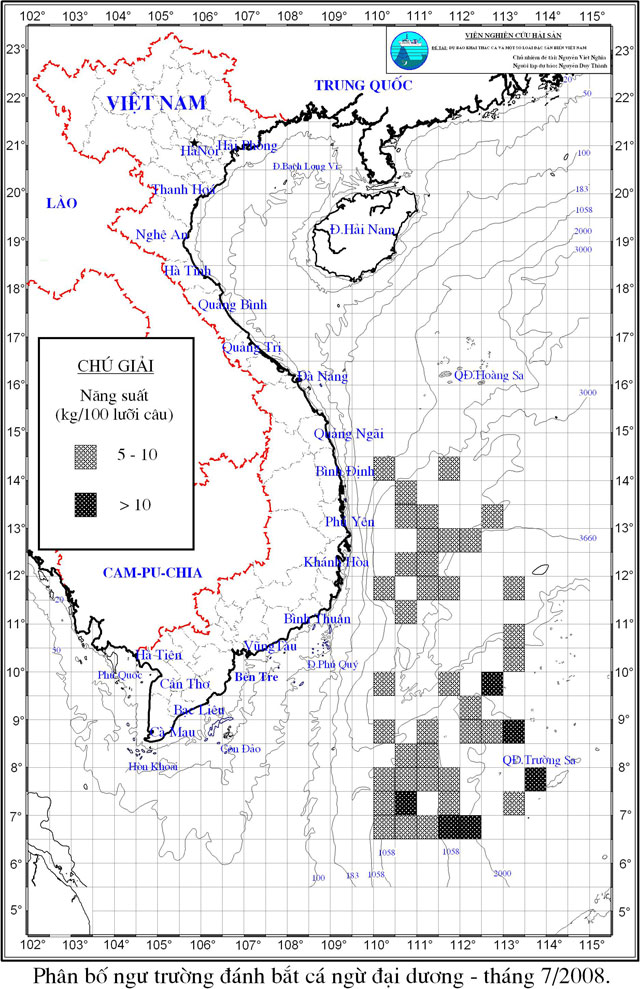 Trang nhất/ Dự báo khai thác theo nghề Câu vàng cá ngừ, Vụ Nam, 07 năm 2008 Mùa vụ: Vụ Nam (07) | Năm dự báo: 2008 | Tháng dự báo: 07/2008 Nghề: Câu cá ngừ đại dương Cơ quan dự báo: