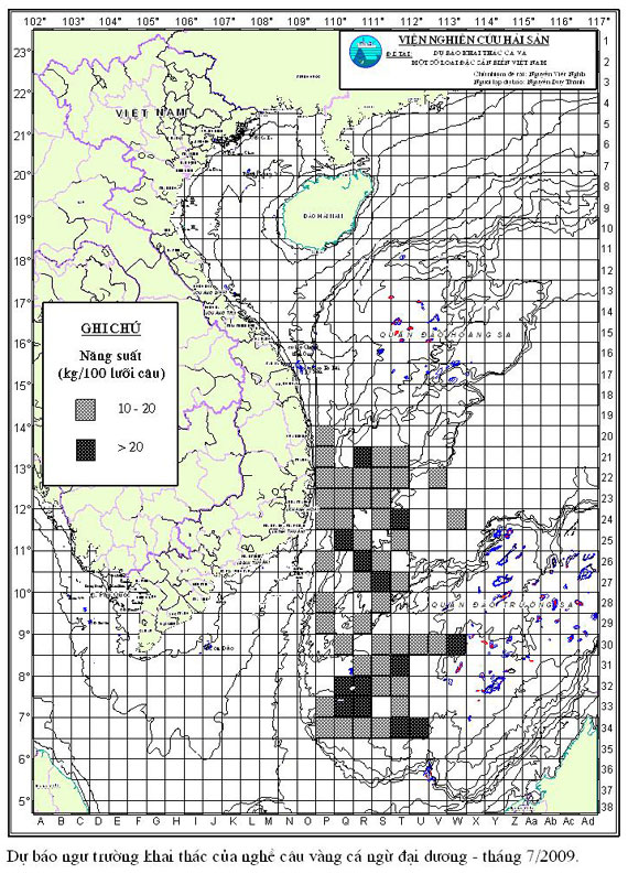 Trang nhất/ Dự báo khai thác theo nghề Câu vàng cá ngừ, Vụ Nam, 07 năm 2009 Mùa vụ: Vụ Nam (07) | Năm dự báo: 2009 | Tháng dự báo: 07/2009 Nghề: Câu cá ngừ đại dương Cơ quan dự báo: