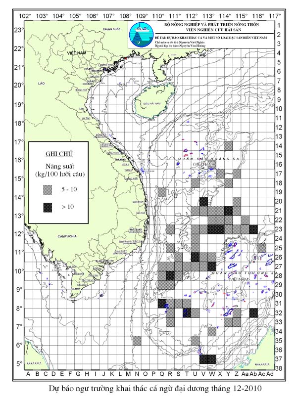 Trang nhất/ Dự báo khai thác theo đối tượng Cá ngừ đại dương, Vụ Bắc, Cả vụ năm 2010 Mùa vụ: Vụ Bắc (Cả vụ) | Năm dự báo: 2010 | Tháng dự báo: 12/2010 Đối tượng dự báo: Cá ngừ đại dương Cơ quan dự báo: Viện nghiên cứu Hải sản