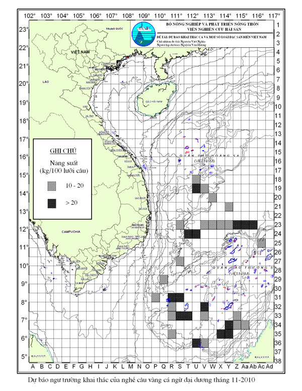 Trang nhất/ Dự báo khai thác theo nghề Câu vàng cá ngừ, Vụ Bắc, 11 năm 2010 Mùa vụ: Vụ Nam (11) | Năm dự báo: 2010 | Tháng dự báo: 11/2010 Nghề: Câu cá ngừ đại dương Cơ quan dự báo: