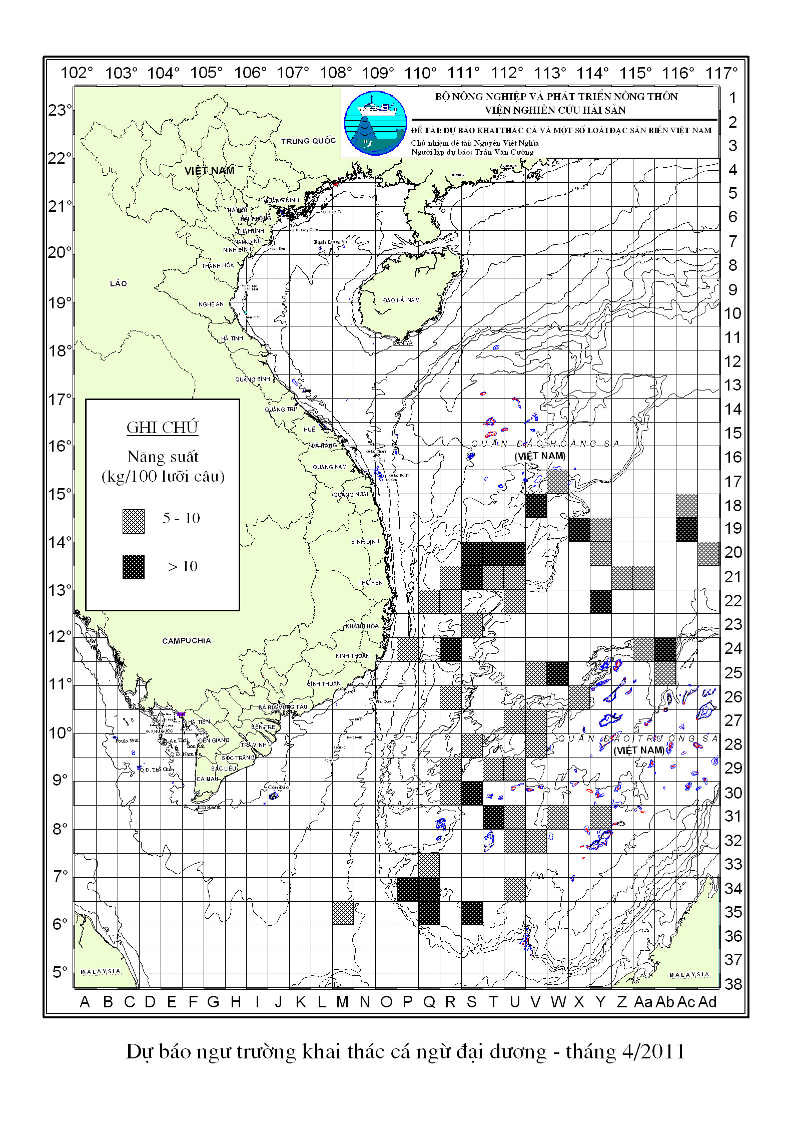 Trang nhất/ Dự báo khai thác theo đối tượng Cá ngừ đại dương, Vụ Nam, Cả vụ năm 2011 Mùa vụ: Vụ Nam (Cả vụ) | Năm dự báo: 2011 | Tháng dự báo: 12/2011 Đối tượng dự báo: Cá ngừ đại dương Cơ quan dự báo: Viện nghiên cứu Hải sản