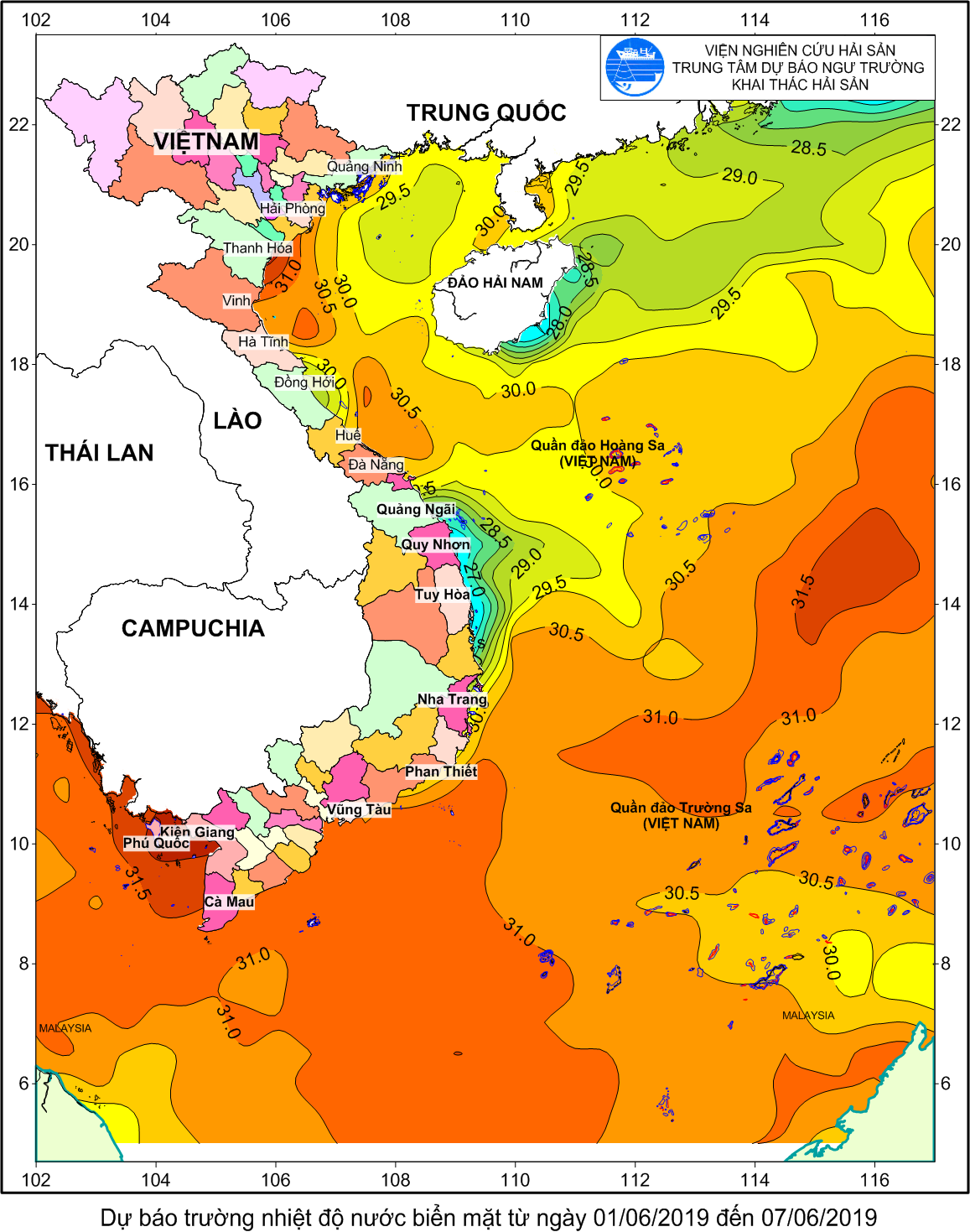 Mùa vụ: Vụ Nam (DB nhiệt độ nước biển tầng mặt từ 01/06/2019 đến 07/06/2019 ) | Năm dự báo: 2019 | Tháng dự báo: 06/2019