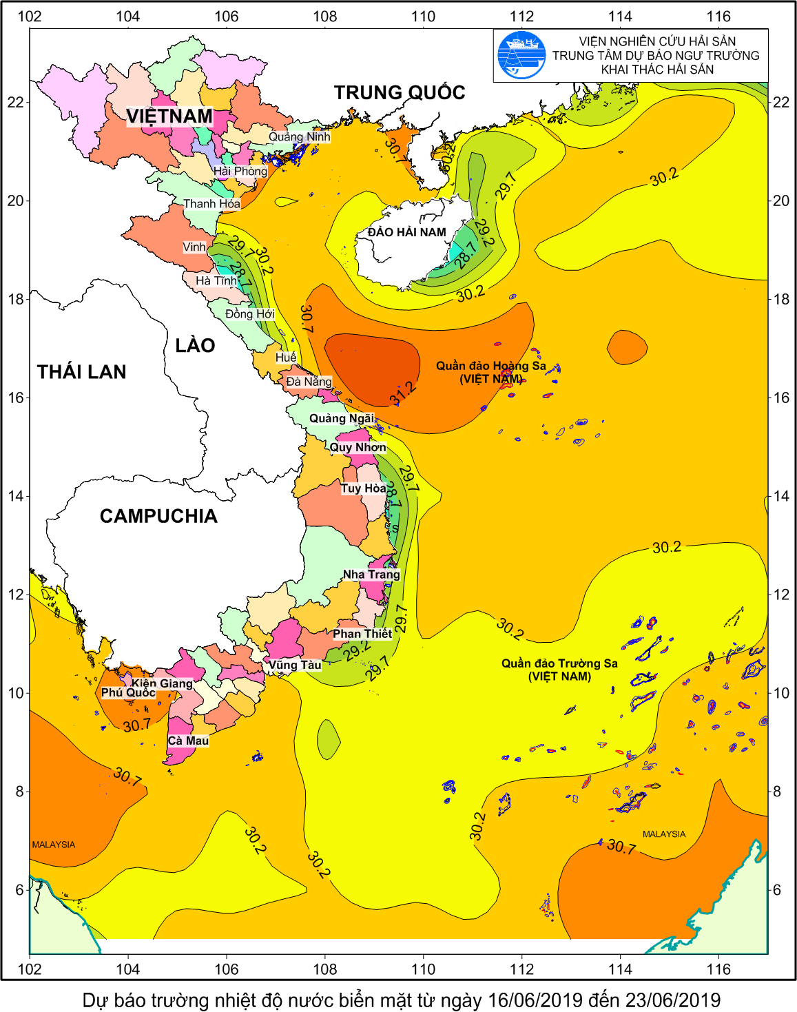 Trang nhất/ Dự báo khai thác theo đối tượng DB nhiệt độ tầng mặt từ 16/06/2019 đến 23/06/2019 Mùa vụ: Vụ Nam (DB nhiệt độ tầng mặt từ 16/06/2019 đến 23/06/2019 ) | Năm dự báo: 2019 | Tháng dự báo: 06/2019 Đối tượng dự báo: Trường nhiệt độ nước biển mặt Cơ quan dự báo: Trung tâm Dự báo ngư trường Khai thác hải sản