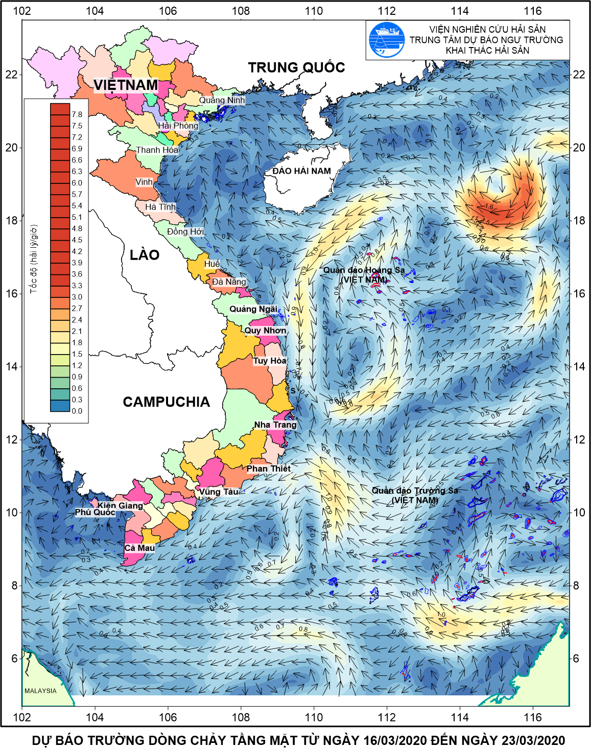Các mục khác... Dự báo ngư trường cá nổi nhỏ tháng 02/2024 Dự báo ngư trường cá ngừ vằn tháng 02/2024 Dự báo dòng chảy biển tầng mặt từ 08-15/01/2024 Dự báo nhiệt độ nước biển tầng mặt từ 08-15/01/2024 Dự báo dòng chảy biển tầng mặt từ 01-07/01/2024