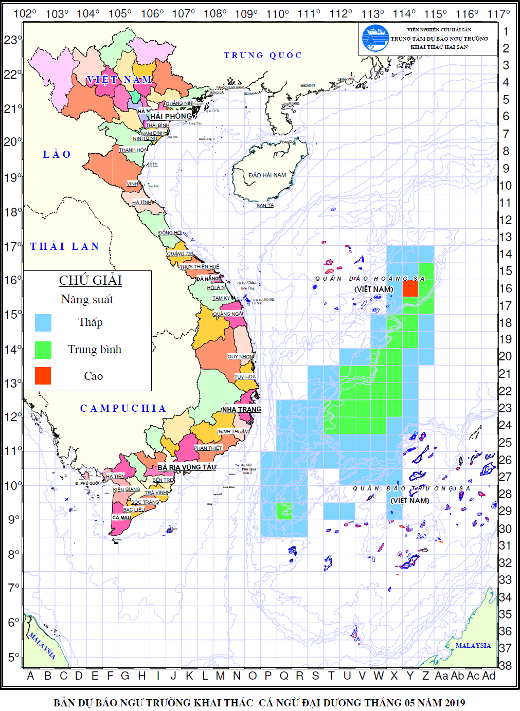 Trang nhất/ Dự báo khai thác theo đối tượng DBNTKT cá ngừ đại dương tháng 05/2019 Mùa vụ: Vụ Nam (DBNTKT cá ngừ đại dương tháng 05/2019) | Năm dự báo: 2019 | Tháng dự báo: 05/2019 Đối tượng dự báo: Cá ngừ đại dương Cơ quan dự báo: Trung tâm Dự báo ngư trường Khai thác hải sản