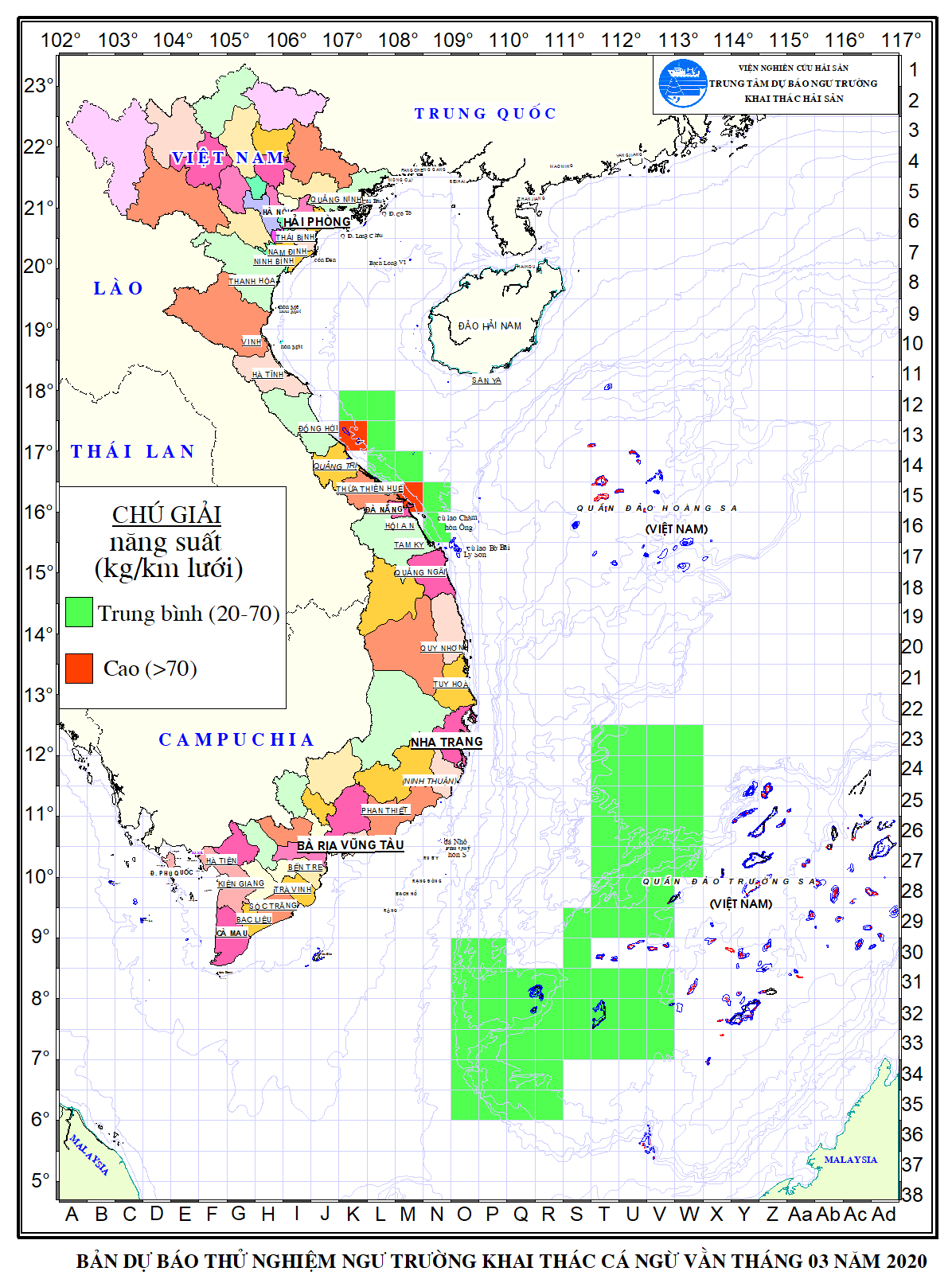 Trang nhất/ Dự báo khai thác theo đối tượng DBNTKT cá ngừ vằn tháng 03/2020 Mùa vụ: Vụ Bắc (DBNTKT cá ngừ vằn tháng 03/2020) | Năm dự báo: 2020 | Tháng dự báo: 03/2020 Đối tượng dự báo: Cá ngừ vằn Cơ quan dự báo: Trung tâm Dự báo ngư trường Khai thác hải sản