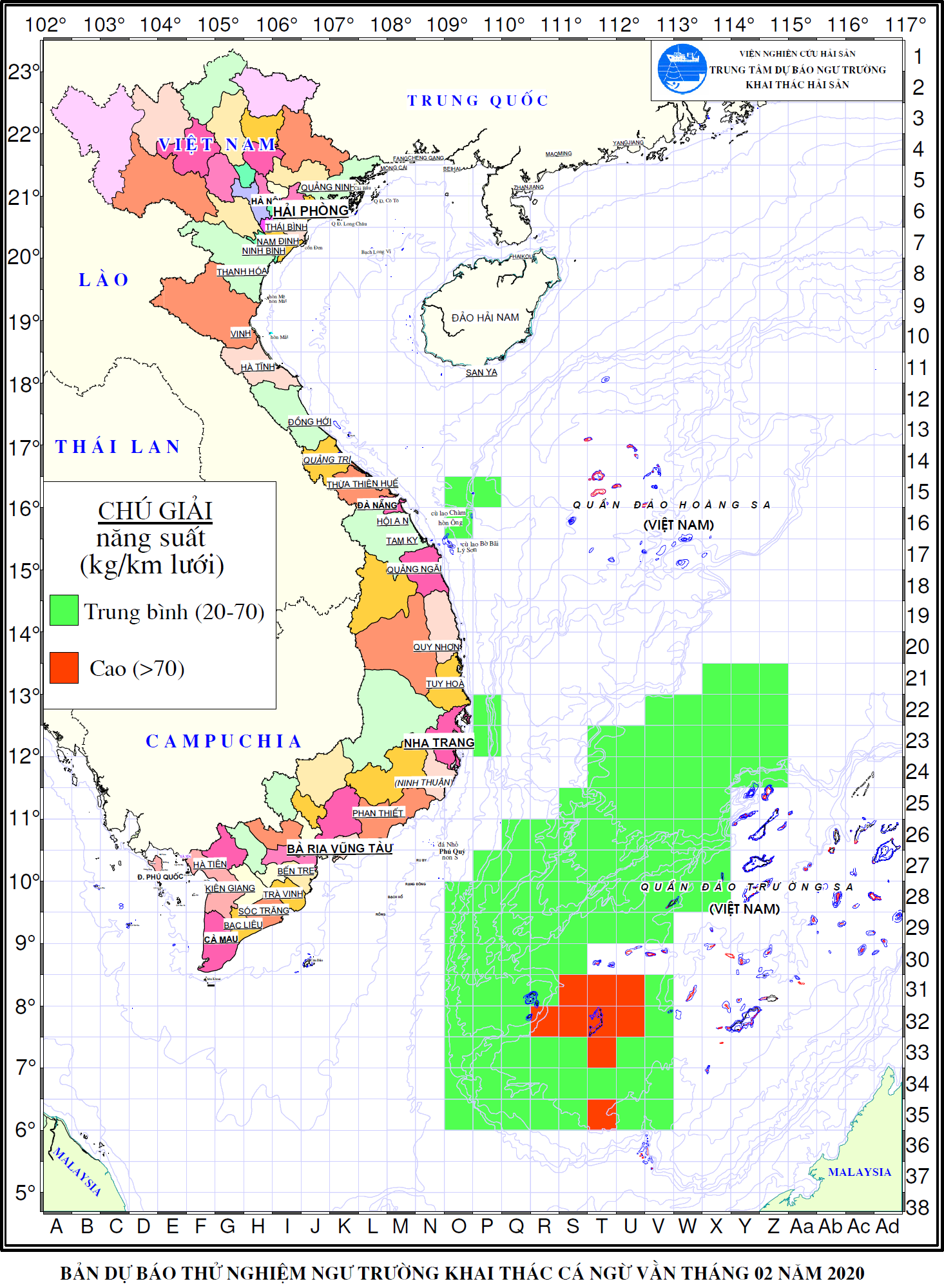 Trang nhất/ Dự báo khai thác theo đối tượng DBNTKT cá ngừ vằn ttháng 02/2019 Mùa vụ: Vụ Bắc (DBNTKT cá ngừ vằn ttháng 02/2019) | Năm dự báo: 2020 | Tháng dự báo: 02/2020 Đối tượng dự báo: Cá ngừ vằn Cơ quan dự báo: Trung tâm Dự báo ngư trường Khai thác hải sản
