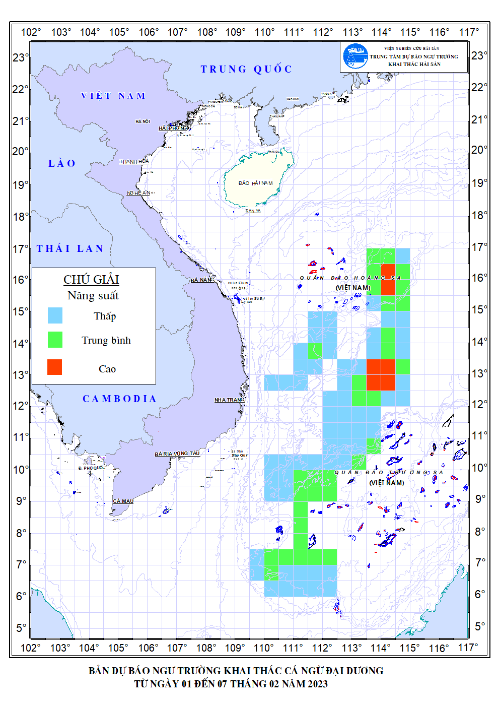 Trang nhất/ Dự báo khai thác theo nghề Dự báo cá ngừ đại dương từ 01-07/02/2023 Mùa vụ: Vụ Bắc () | Năm dự báo: 2023 | Tháng dự báo: 02/2023 Nghề: Câu cá ngừ đại dương Cơ quan dự báo: Trung tâm Dự báo ngư trường Khai thác hải sản