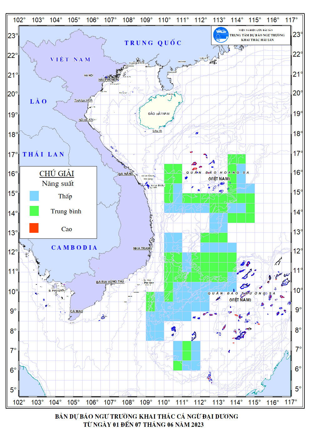 Trang nhất/ Dự báo khai thác theo nghề Dự báo cá ngừ đại dương từ 01-07/6/2023 Mùa vụ: Vụ Nam () | Năm dự báo: 2023 | Tháng dự báo: 06/2023 Nghề: Câu cá ngừ đại dương Cơ quan dự báo: Trung tâm Dự báo ngư trường Khai thác hải sản
