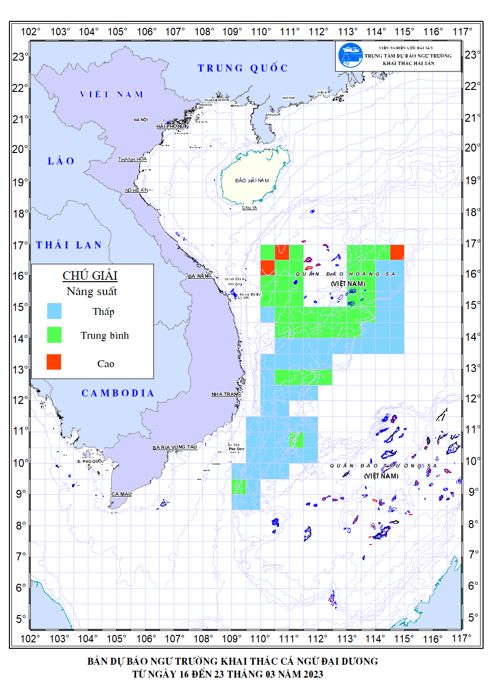 Trang nhất/ Dự báo khai thác theo nghề Dự báo cá ngừ đại dương từ 16-23/3/2023 Mùa vụ: Vụ Bắc () | Năm dự báo: 2023 | Tháng dự báo: 03/2023 Nghề: Câu cá ngừ đại dương Cơ quan dự báo: Trung tâm Dự báo ngư trường Khai thác hải sản