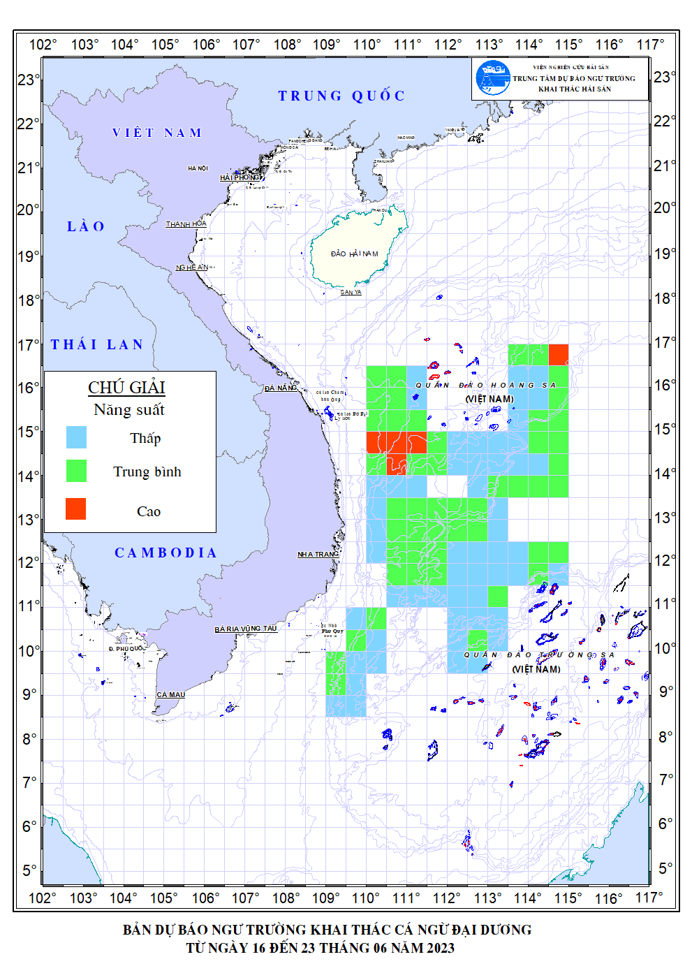 Trang nhất/ Dự báo khai thác theo nghề Dự báo cá ngừ đại dương từ 16-23/6/2023 Mùa vụ: Vụ Nam () | Năm dự báo: 2023 | Tháng dự báo: 06/2023 Nghề: Câu cá ngừ đại dương Cơ quan dự báo: Trung tâm Dự báo ngư trường Khai thác hải sản