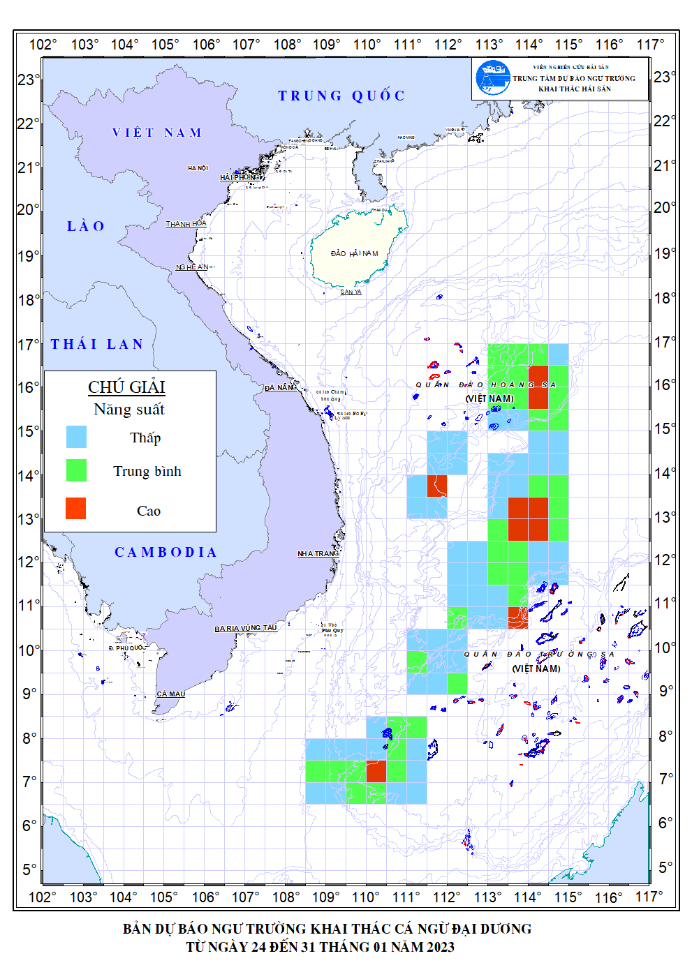Trang nhất/ Dự báo khai thác theo nghề Dự báo cá ngừ đại dương từ 24-31/01/2023 Mùa vụ: Vụ Bắc () | Năm dự báo: 2023 | Tháng dự báo: 01/2023 Nghề: Câu cá ngừ đại dương Cơ quan dự báo: Trung tâm Dự báo ngư trường Khai thác hải sản