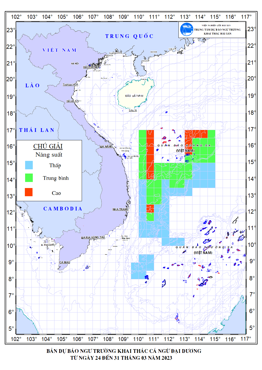 Trang nhất/ Dự báo khai thác theo nghề Dự báo cá ngừ đại dương từ 24-31/3/2023 Mùa vụ: Vụ Bắc () | Năm dự báo: 2023 | Tháng dự báo: 03/2023 Nghề: Câu cá ngừ đại dương Cơ quan dự báo: Trung tâm Dự báo ngư trường Khai thác hải sản