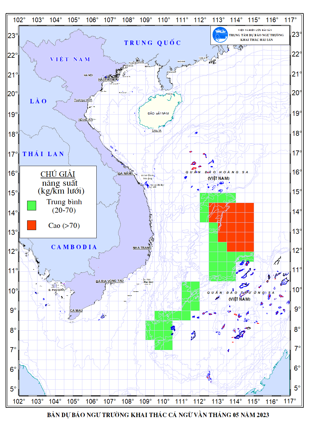 Trang nhất/ Dự báo khai thác theo đối tượng Dự báo cá ngừ vằn tháng 5/2023 Mùa vụ: Vụ Nam () | Năm dự báo: 2023 | Tháng dự báo: 05/2023 Đối tượng dự báo: Cá ngừ vằn Cơ quan dự báo: Trung tâm Dự báo ngư trường Khai thác hải sản