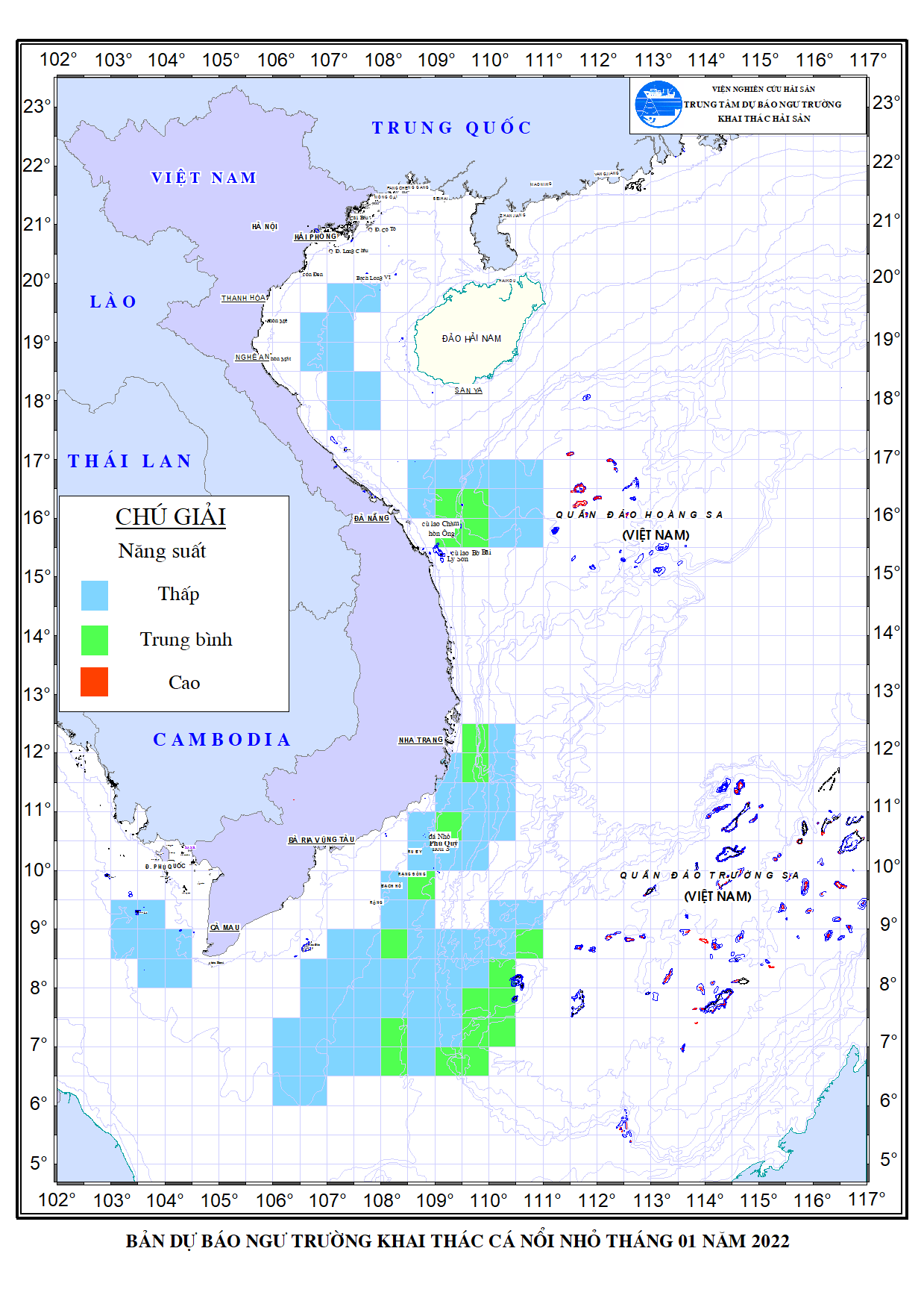 Trang nhất/ Dự báo khai thác theo đối tượng Dự báo cá nổi nhỏ tháng 01/2022 Mùa vụ: Vụ Bắc () | Năm dự báo: 2022 | Tháng dự báo: 01/2022 Đối tượng dự báo: Cá nổi nhỏ Cơ quan dự báo: Trung tâm Dự báo ngư trường Khai thác hải sản