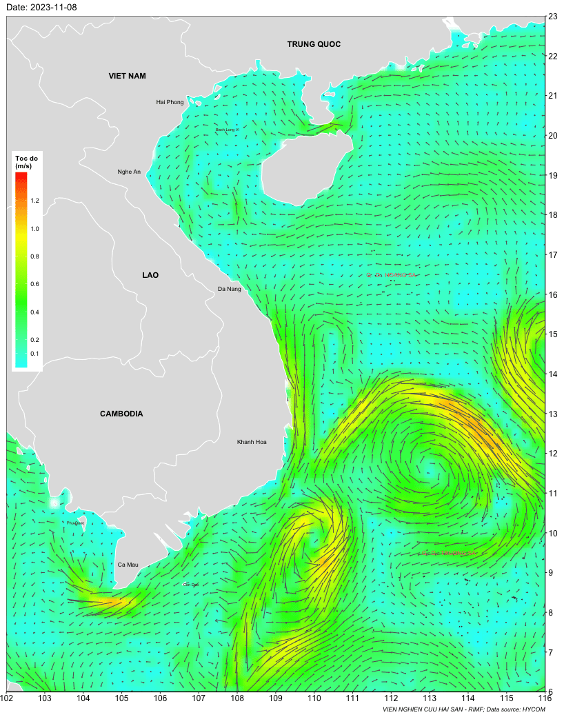 Trang nhất/ Dự báo khai thác theo đối tượng Dự báo dòng chảy biển tầng mặt từ 08-15/11/2023 Mùa vụ: Vụ Bắc () | Năm dự báo: 2023 | Tháng dự báo: 11/2023 Đối tượng dự báo: Trường dòng chảy tầng mặt Cơ quan dự báo: Trung tâm Dự báo ngư trường Khai thác hải sản