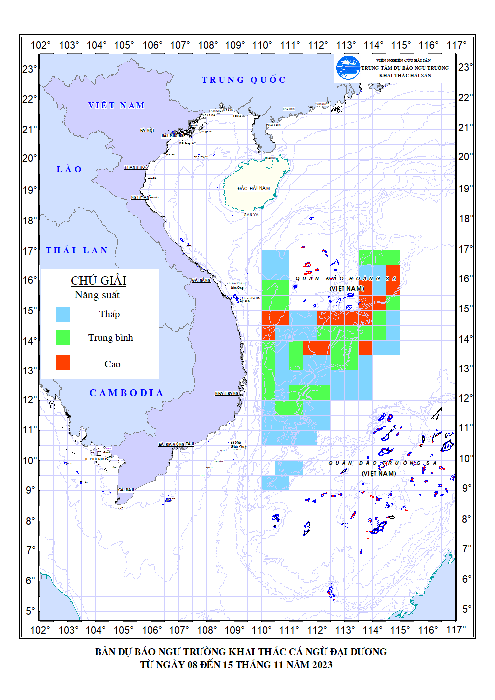 Trang nhất/ Dự báo khai thác theo nghề Dự báo cá ngừ đại dương từ 8-15/11/2023 Mùa vụ: Vụ Bắc () | Năm dự báo: 2023 | Tháng dự báo: 11/2023 Nghề: Câu cá ngừ đại dương Cơ quan dự báo: Trung tâm Dự báo ngư trường Khai thác hải sản