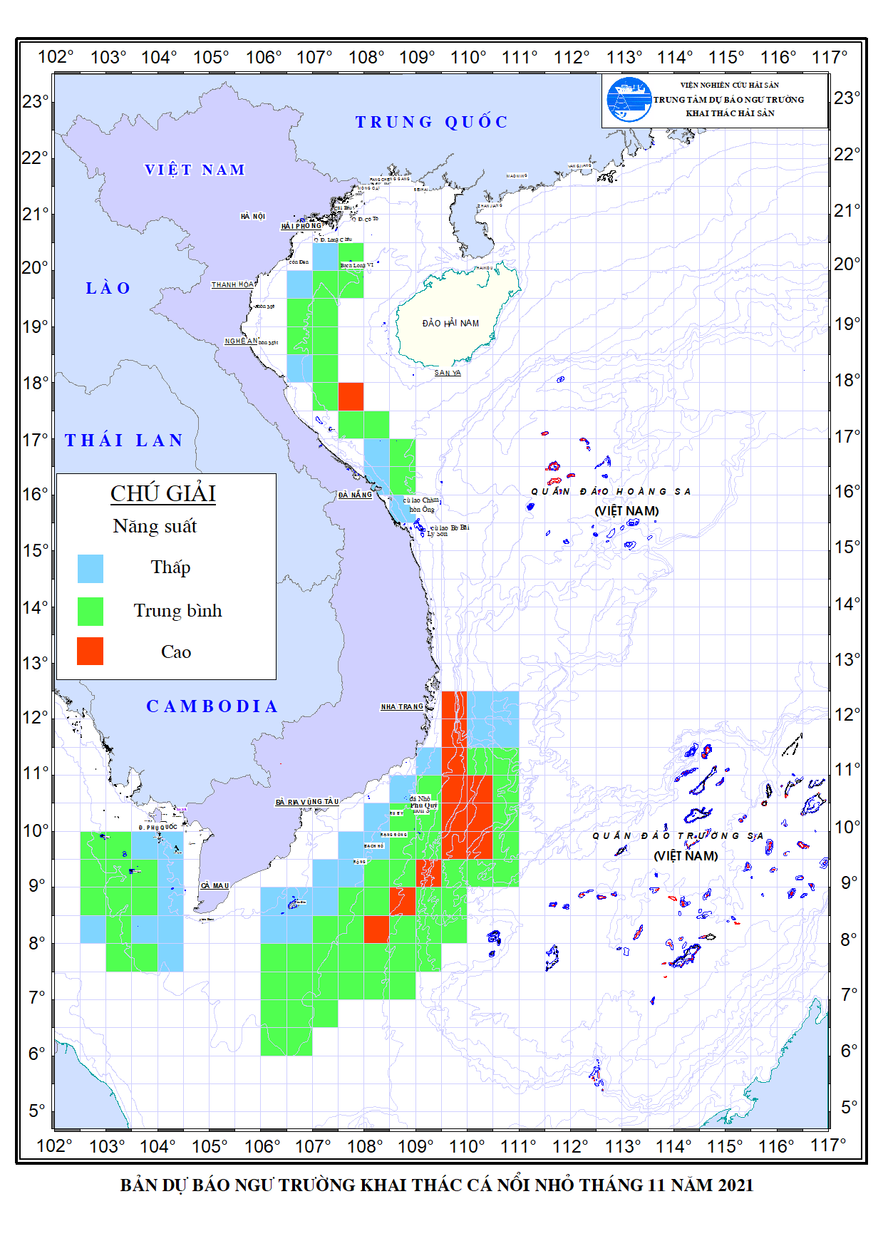 Trang nhất/ Dự báo khai thác theo đối tượng Dự báo hạn tháng cá nổi nhỏ tháng 11/2021 Mùa vụ: Vụ Bắc () | Năm dự báo: 2021 | Tháng dự báo: 11/2021 Đối tượng dự báo: Cá nổi nhỏ Cơ quan dự báo: Trung tâm Dự báo ngư trường Khai thác hải sản