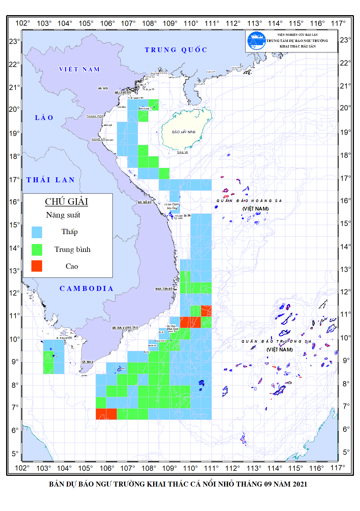 Trang nhất/ Dự báo khai thác theo đối tượng Dự báo hạn tháng cá nổi nhỏ tháng 9/2021 Mùa vụ: Vụ Nam () | Năm dự báo: 2021 | Tháng dự báo: 09/2021 Đối tượng dự báo: Cá nổi nhỏ Cơ quan dự báo: Trung tâm Dự báo ngư trường Khai thác hải sản