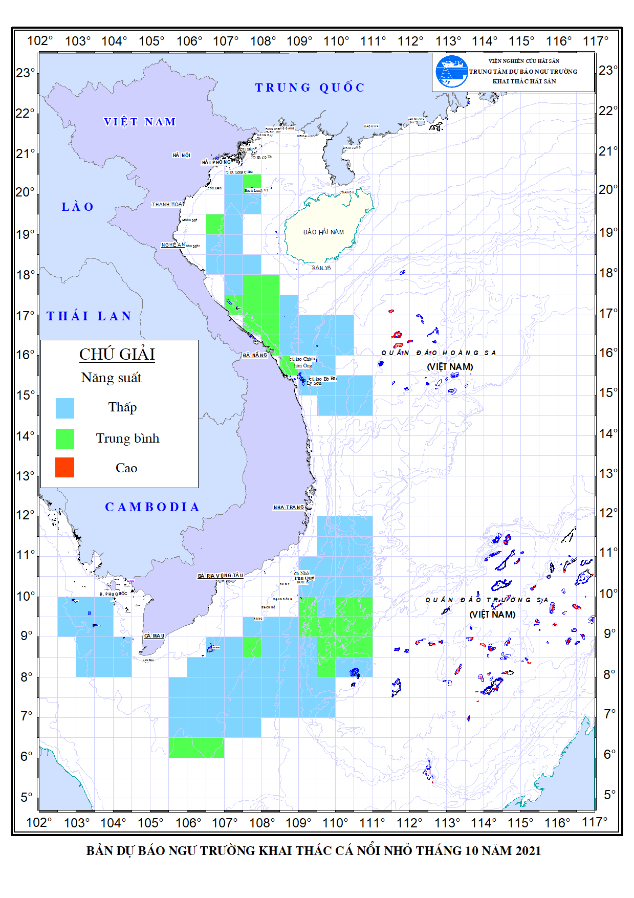 Trang nhất/ Dự báo khai thác theo đối tượng Dự báo hạn tháng ngư trường cá nổi nhỏ tháng 10/2021 Mùa vụ: Vụ Bắc () | Năm dự báo: 2021 | Tháng dự báo: 10/2021 Đối tượng dự báo: Cá nổi nhỏ Cơ quan dự báo: Trung tâm Dự báo ngư trường Khai thác hải sản