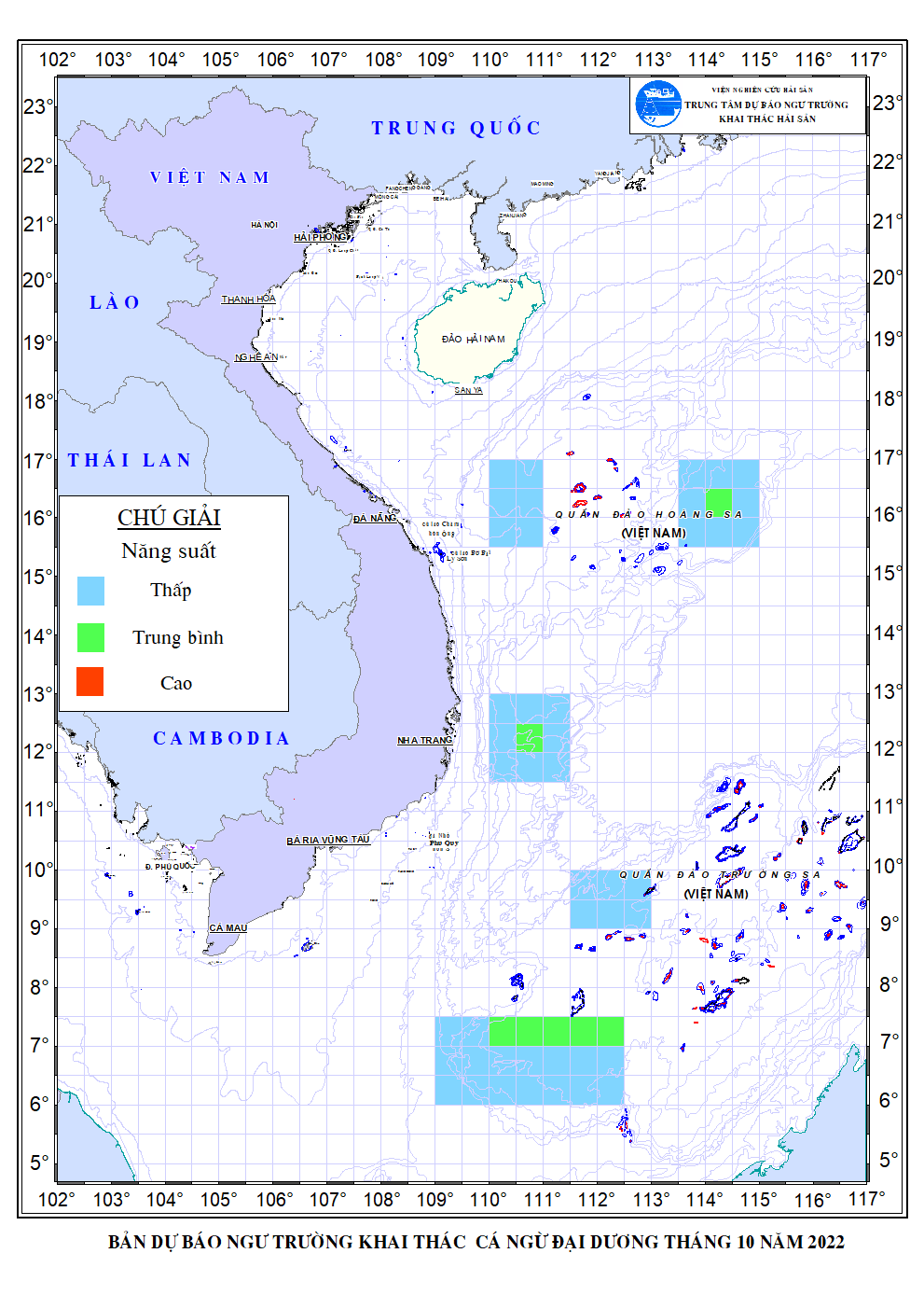 Trang nhất/ Dự báo khai thác theo nghề Dự báo nghề câu cá ngừ đại dương tháng 10/2022 Mùa vụ: Vụ Bắc () | Năm dự báo: 2022 | Tháng dự báo: 10/2022 Nghề: Câu cá ngừ đại dương Cơ quan dự báo: Trung tâm Dự báo ngư trường Khai thác hải sản