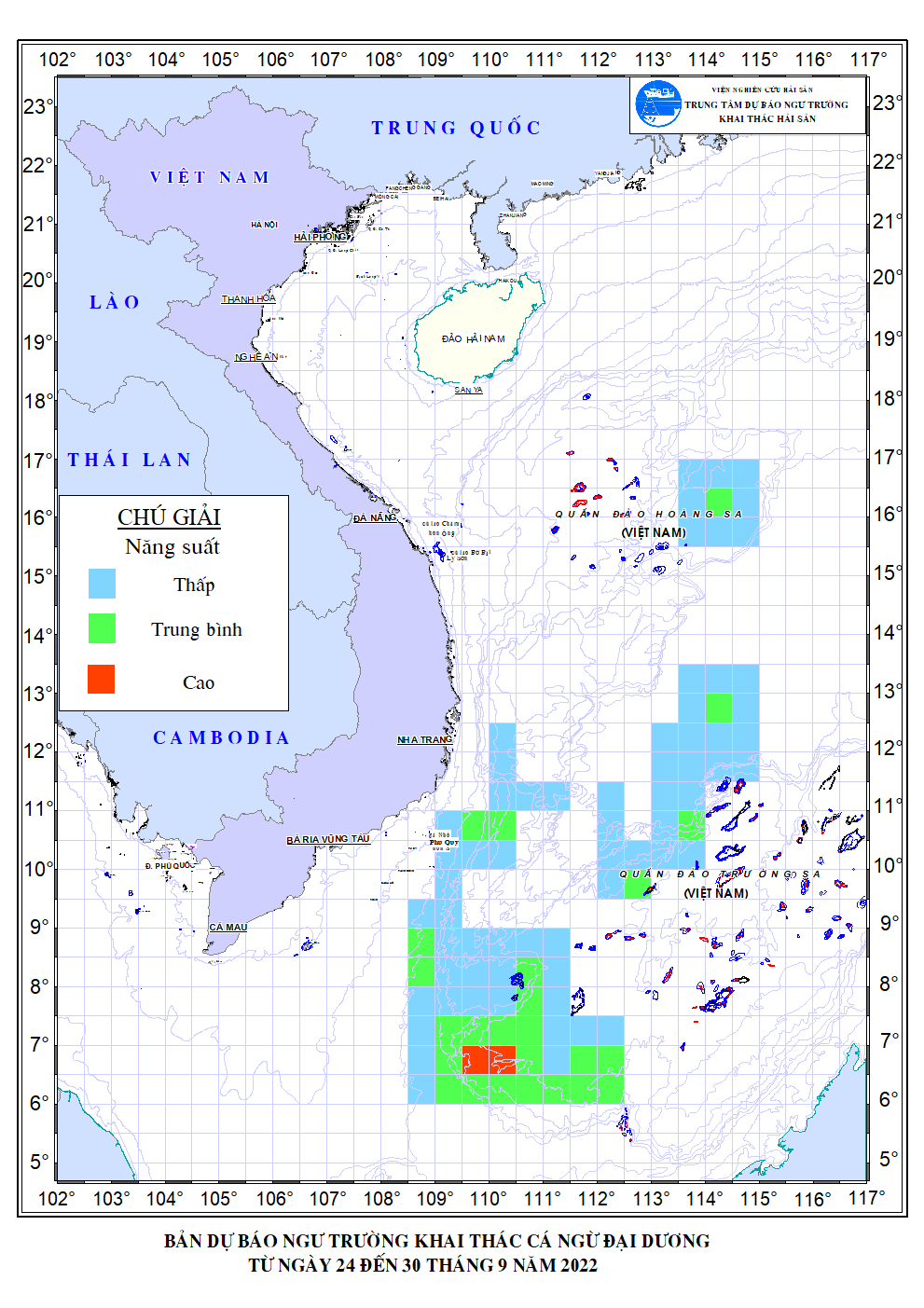 Trang nhất/ Dự báo khai thác theo nghề Dự báo nghề câu cá ngừ đại dương từ 24-30/9/2022 Mùa vụ: Vụ Nam () | Năm dự báo: 2022 | Tháng dự báo: 09/2022 Nghề: Câu cá ngừ đại dương Cơ quan dự báo: Trung tâm Dự báo ngư trường Khai thác hải sản