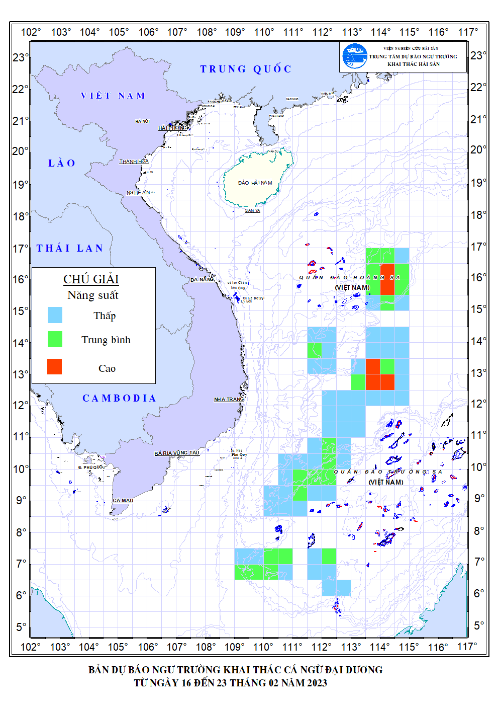 Trang nhất/ Dự báo khai thác theo nghề Dự báo ngư trường cá ngừ đại dương từ 16-23/02/2023 Mùa vụ: Vụ Bắc () | Năm dự báo: 2023 | Tháng dự báo: 02/2023 Nghề: Câu cá ngừ đại dương Cơ quan dự báo: Trung tâm Dự báo ngư trường Khai thác hải sản