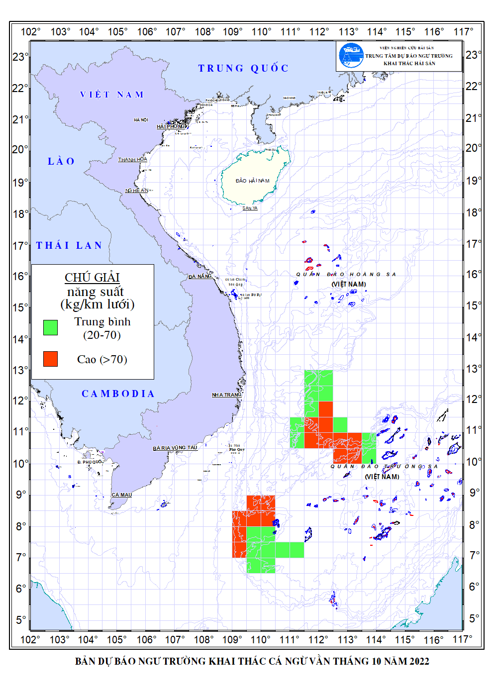 Trang nhất/ Dự báo khai thác theo đối tượng Dự báo ngư trường cá ngừ vằn tháng 10/2022 Mùa vụ: Vụ Bắc () | Năm dự báo: 2022 | Tháng dự báo: 10/2022 Đối tượng dự báo: Cá ngừ vằn Cơ quan dự báo: Trung tâm Dự báo ngư trường Khai thác hải sản